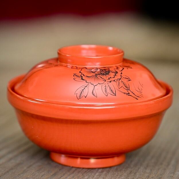 表の黒のお花のモダンさと蓋を開けたときにハッとすることりの沈金。小鳥のさえずりが聞こえてきそう。オレンジに近い朱色です。